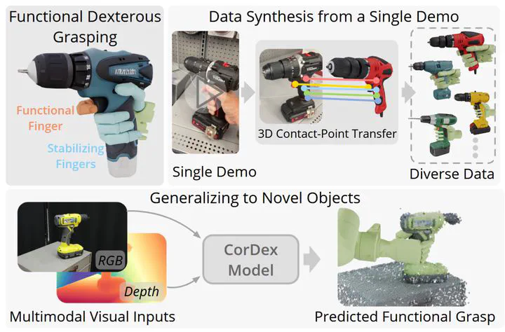 Functional grasping with dexterous robotic hands is a key capability for enabling tool use and complex manipulation, yet progress has been constrained by two persistent bottlenecks: the scarcity of large-scale datasets and the absence of integrated semantic and geometric reasoning in learned models. In this work, we present CorDex, a framework that robustly learns dexterous functional grasps of novel objects from synthetic data generated from just a single human demonstration. At the core of our approach is a correspondence-based data engine that generates diverse, high-quality training data in simulation. Based on the human demonstration, our data engine generates diverse object instances of the same category, transfers the expert grasp to the generated objects through correspondence estimation, and adapts the grasp through optimization. Building on the generated data, we introduce a multimodal prediction network that integrates visual and geometric information. By devising a local–global fusion module and an importance-aware sampling mechanism, we enable robust and computationally efficient prediction of functional dexterous grasps. Through extensive experiments across various object categories, we demonstrate that CorDex generalizes well to unseen object instances and significantly outperforms state-of-the-art baselines.